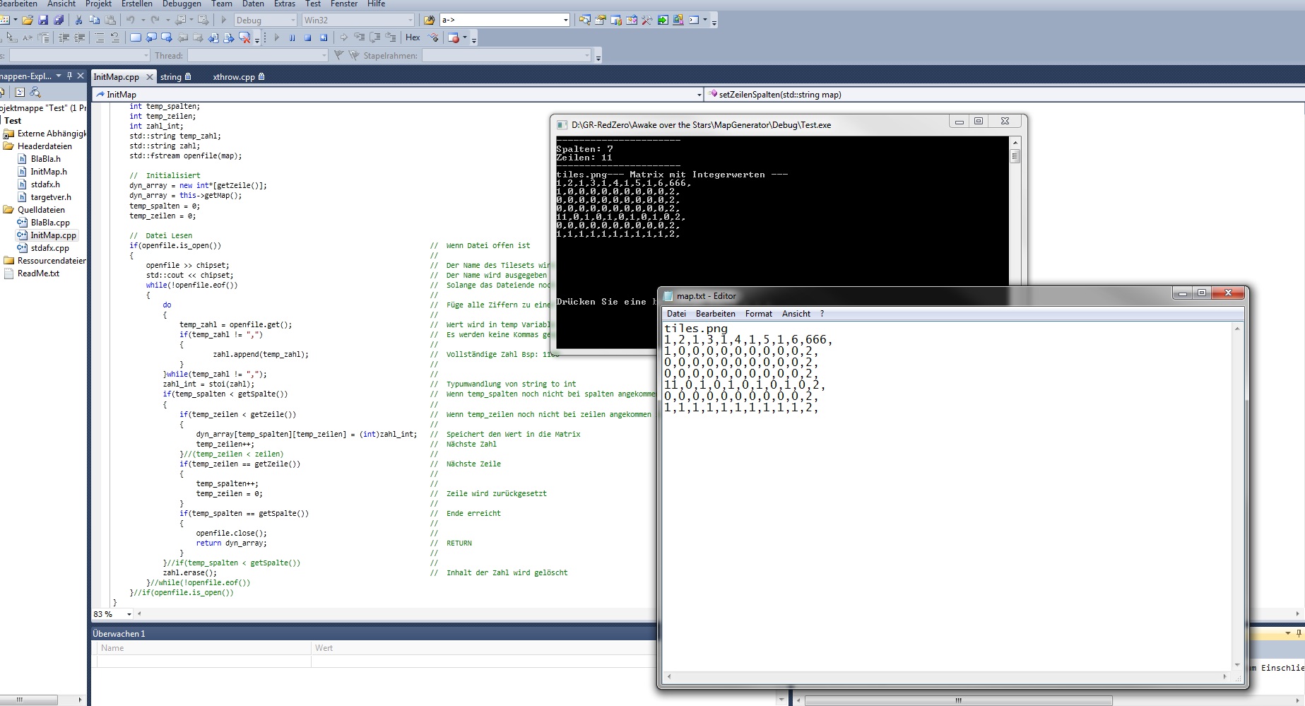 initMap->setZeilenSpalten("map.txt"); initMap->setMap(initMap->erstelleMatrix()); initMap->leseMapDatei("map.txt");schreiben müssen um eine Map zu laden. Ein einfaches