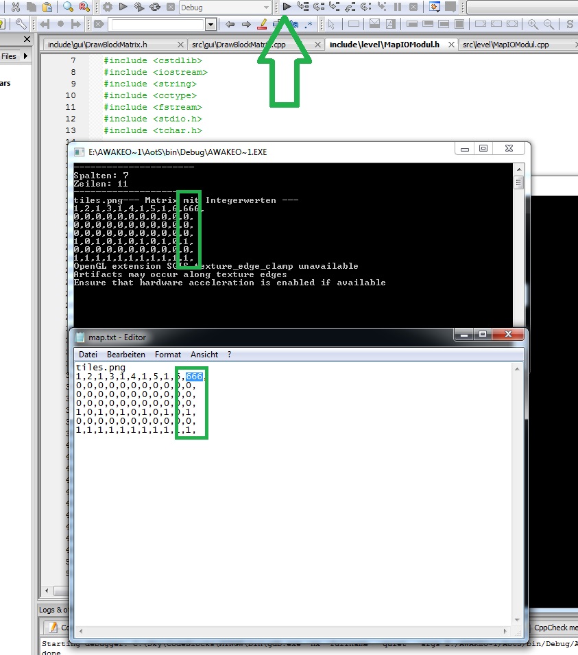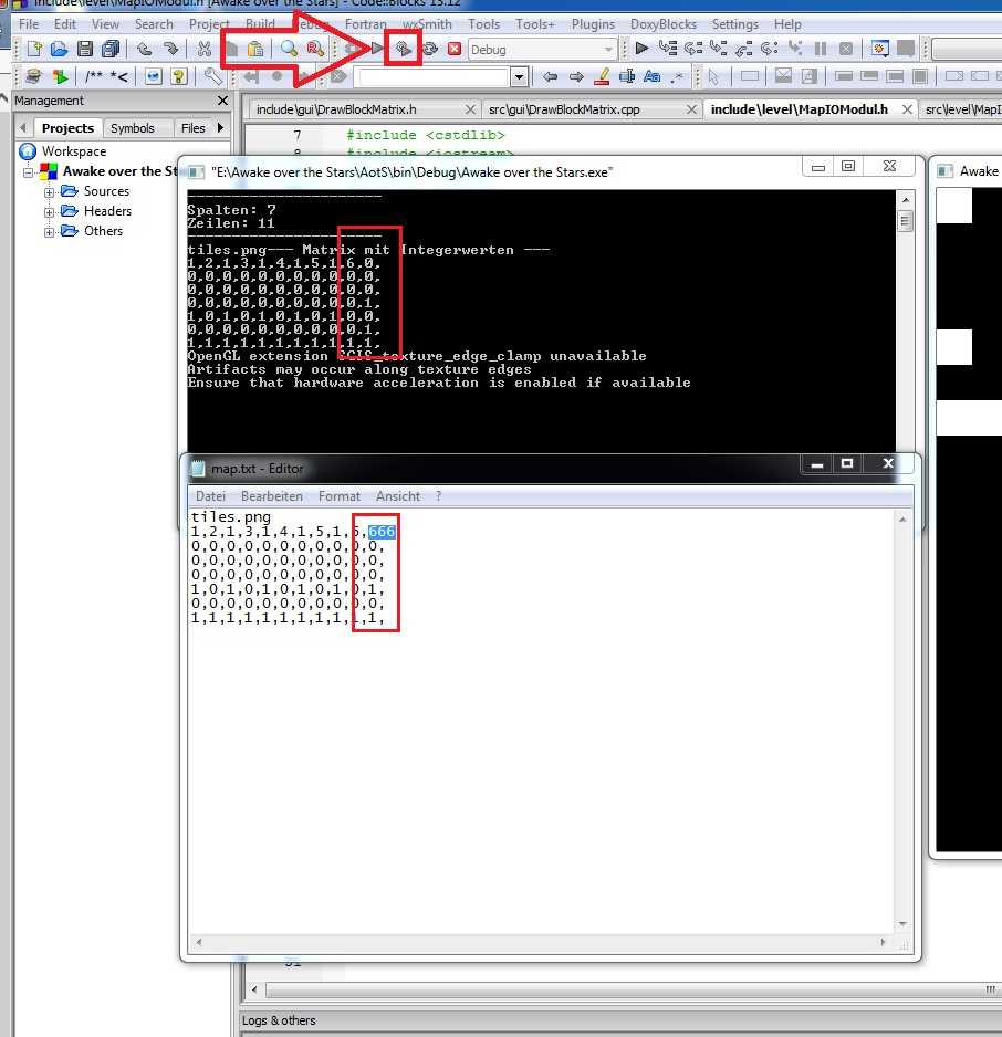 ||=== Build: Debug in Awake over the Stars (compiler: GNU GCC Compiler) ===| K:\Awake over the Stars\AotS\src\level\MapIOModul.cpp||In member function 'void MapIOModul::setZeilenSpalten(std::string)':| K:\Awake over the Stars\AotS\src\level\MapIOModul.cpp|166|warning: variable 'temp_spalten' set but not used [-Wunused-but-set-variable]| K:\Awake over the Stars\AotS\src\level\MapIOModul.cpp|167|warning: variable 'temp_zeilen' set but not used [-Wunused-but-set-variable]| K:\Awake over the Stars\AotS\src\level\MapIOModul.cpp||In member function 'int** MapIOModul::erstelleMatrix()':| K:\Awake over the Stars\AotS\src\level\MapIOModul.cpp|241|warning: variable 'temp_spalten' set but not used [-Wunused-but-set-variable]| K:\Awake over the Stars\AotS\src\level\MapIOModul.cpp|242|warning: variable 'temp_zeilen' set but not used [-Wunused-but-set-variable]| K:\Awake over the Stars\AotS\src\level\MapIOModul.cpp||In member function 'void MapIOModul::mapGenerator()':| K:\Awake over the Stars\AotS\src\level\MapIOModul.cpp|267|warning: missing braces around initializer for 'int [25]' [-Wmissing-braces]| K:\Awake over the Stars\AotS\src\level\MapIOModul.cpp||In member function 'int** MapIOModul::leseMapDatei(std::string)':| K:\Awake over the Stars\AotS\src\level\MapIOModul.cpp|158|warning: control reaches end of non-void function [-Wreturn-type]| ||=== Build finished: 0 error(s), 6 warning(s) (0 minute(s), 3 second(s)) ===|Ich kann ansonstan auch das VS2010 projekt zeigen, dort ist alles im zusammenhang drinne:
