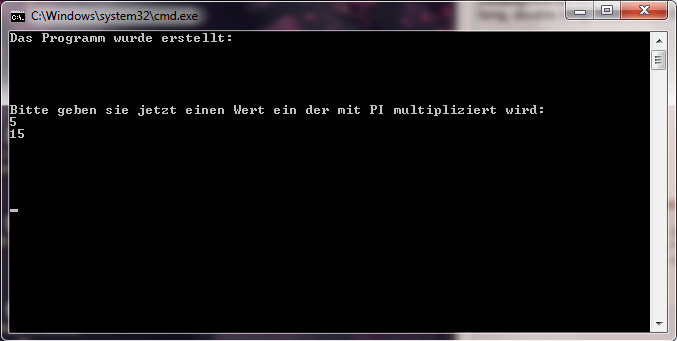 #include <iostream> using namespace std; int main() { int a,rechnung; cout << "Bitte geben sie jetzt einen Wert ein der mit PI multipliziert wird:" << endl; cin >> a; double long PI = 3.14159265358932; a = rechnung = a * PI; cout << rechnung << endl; return 0; }